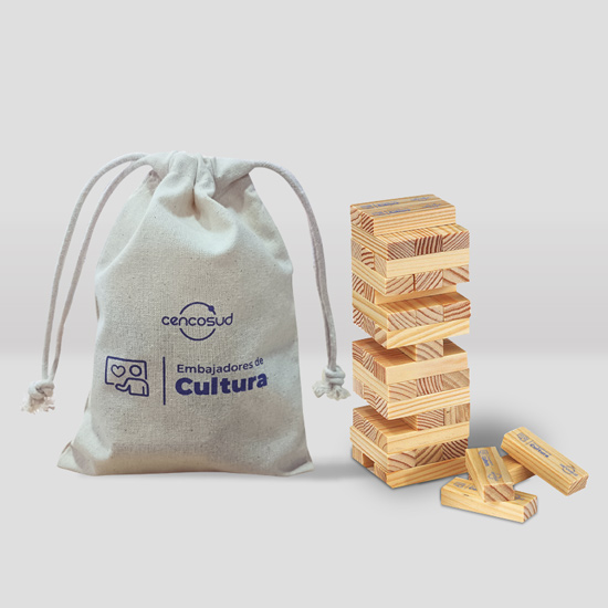 Producción de Juego Jenga con logo impreso a un color + bolsa con logo impreso a un color.